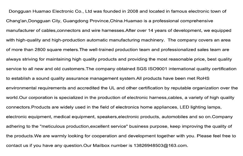 All our harnesses are made according to your drawing or sample. We are the OEM wire harness supplier.If you have any need,you can contact us with E-mail: 13826948503@163.com.